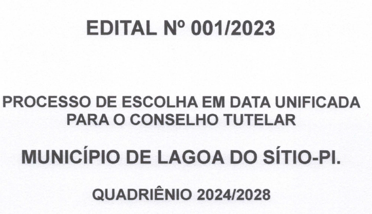 Data: 10/04/2023A PRESIDENTE DO CONSELHO MUNICIPAL DOS DIREITOS DA CRIANÇA E DO ADOLESCENTE DO MUNICÍPIO DE LAGOA DO SÍTIO-PI, no uso das atribuições legais que lhes são conferidas pela Lei Munic~al nº 292/2021 de 02 de junho de 2021, torna público o presente EDITAL DE CONVOCAÇAO para o Processo de Escolha em Data Unificada para Membros do Conselho Tutelar do Município de Lagoa do Sítio-PI, para o quadriênio 2024/2028, aprovado pela Resolução nº 002/2023 do CMDCA local.