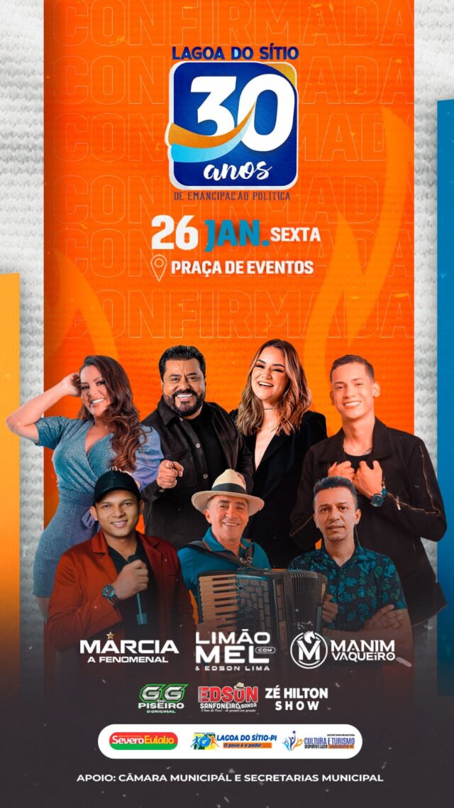 Data: 12/01/2024Lagoa do Sítio comemora 30 anos no próximo dia 26 de janeiro e a Prefeitura Municipal prepara uma grande festa para comemorar a data. O prefeito Sávio Moura confirmou seis atrações para animar o aniversário com destaque para a Banda Limão com Mel, Márcia a fenomenal, Manim Vaqueiro, Edson Sanfoneiro, Zé Hilton Show e GG do Piseiro. A festa acontecerá na praça de eventos.